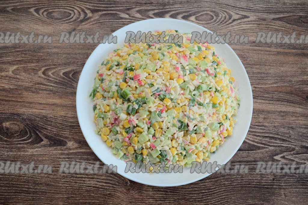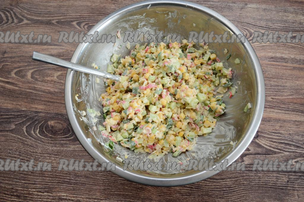 Посолить салат по вкусу и заправить майонезом. Много майонеза не добавляйте, тогда формировать салат будет несложно. Крабовый салат должен получиться достаточно сочным, но и плавать ингредиенты в майонезе не должны.