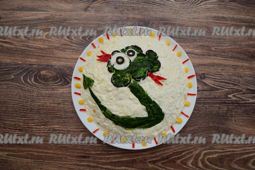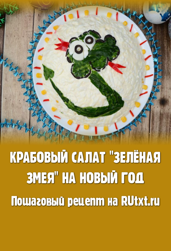 Вот такой вкусный праздничный крабовый салат с симпатичной зелёной змейкой можно подать к новогоднему столу.