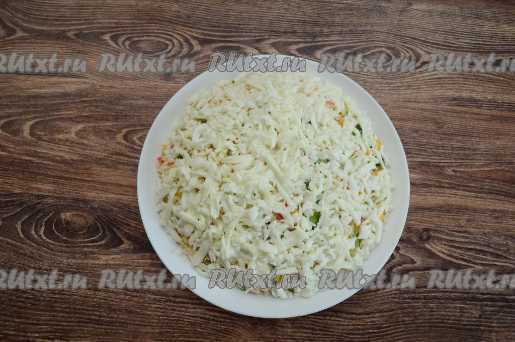 Поверх белков нанести майонез, разровнять его при помощи лопатки, придавая салату законченную аккуратную форму.