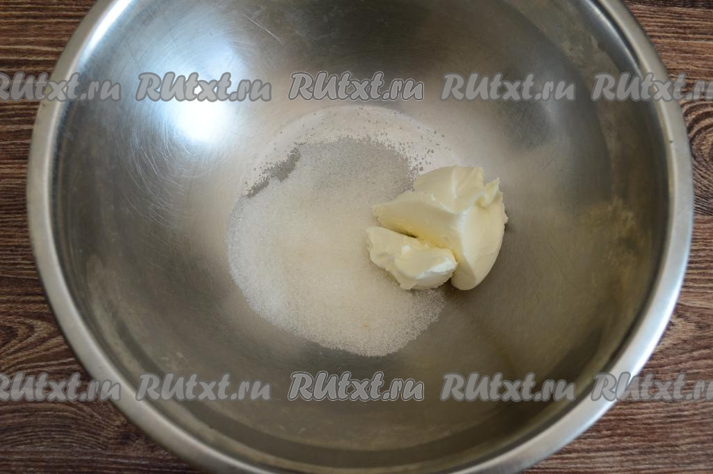 В глубокую миску выложить творожный сыр, добавить сахар.