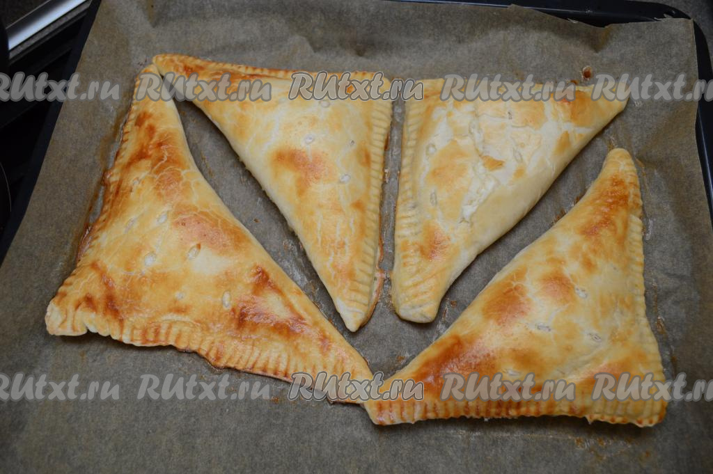Достать противень с готовой выпечкой из духовки. Такие слойки можно есть и тёплыми, и остывшими.
