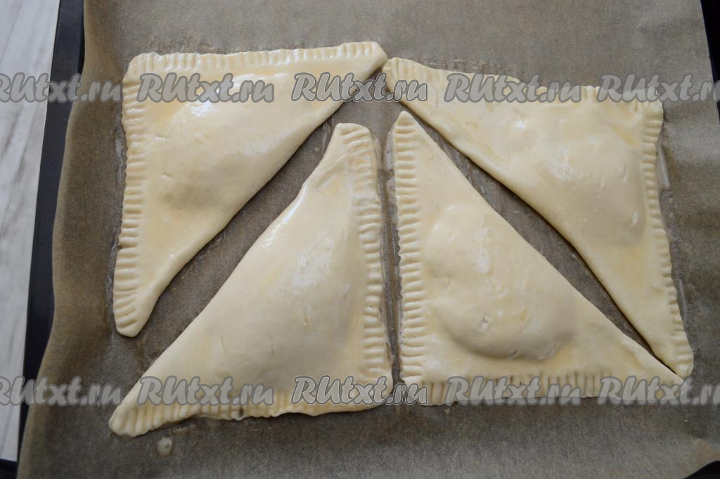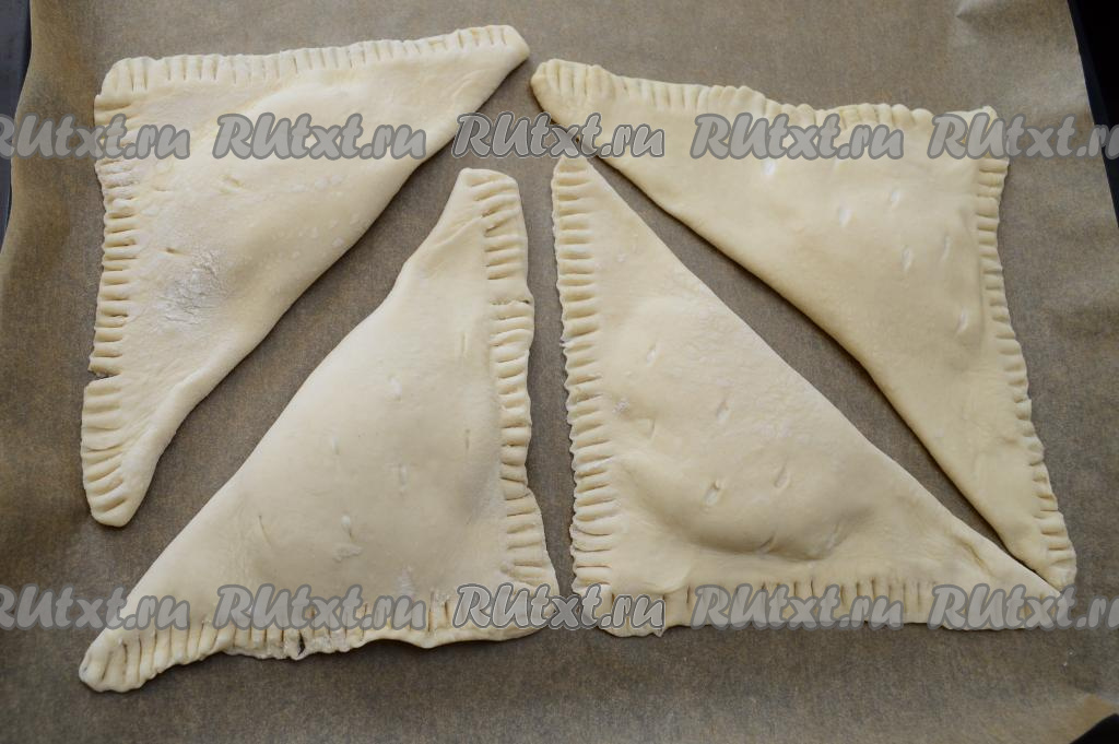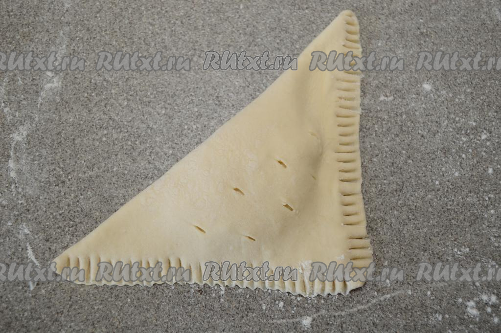 Накрыть начинку стороной с надрезами, сформировав треугольную слойку.