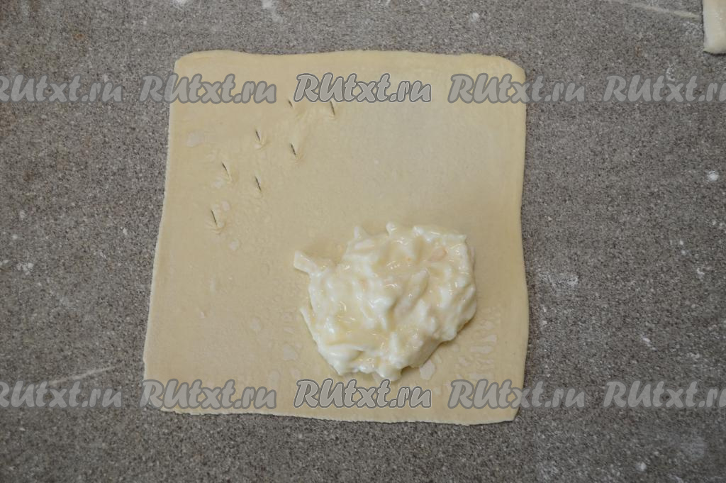 Сформированную слойку с творожным сыром и яблоком выложить на противень, застеленный пергаментом. Аналогично сформировать ещё 3 слойки из оставшихся квадратиков теста и начинки.