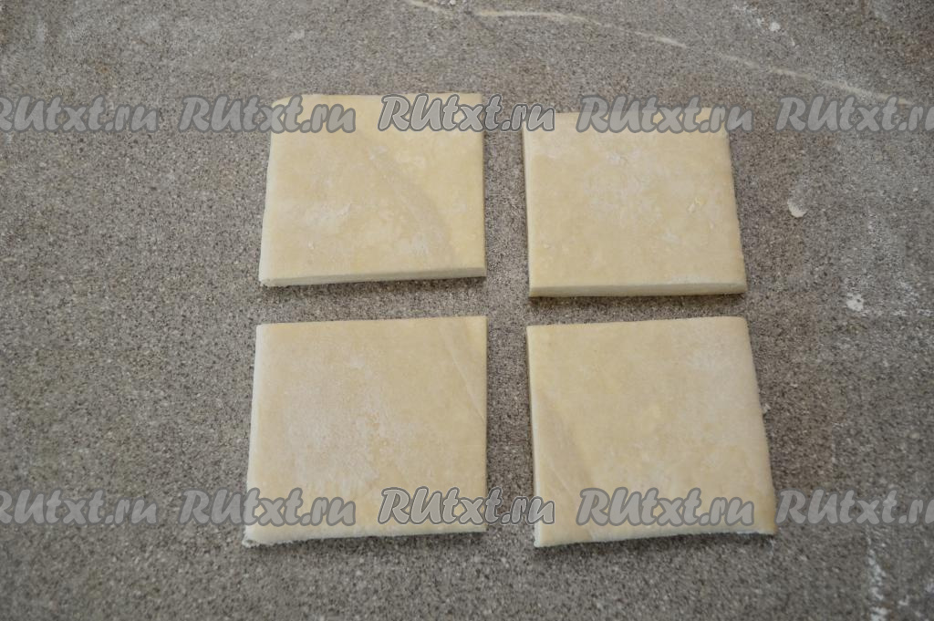 Пласт размороженного слоёного теста разделить на 4 равных квадратика.