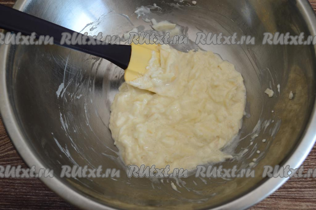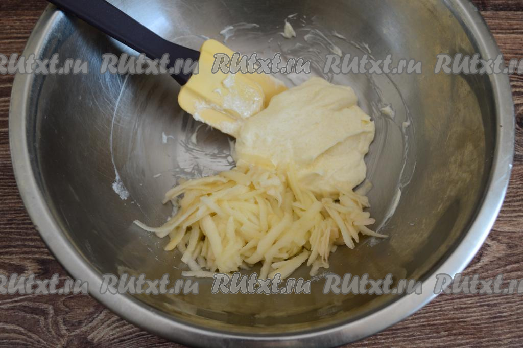 Смешать сахар и сыр при помощи лопатки до получения однородной творожной массы. Яблоко очистить от кожуры и натереть на крупной тёрке, удаляя семечки и семенную коробку. Натёртое яблоко добавить в миску с творожной массой.