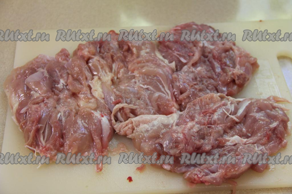 Куриные окорочка помыть и обсушить. Отделить мякоть от костей, чтобы получился пласт мяса с кожей. Если у вас филе, тогда каждое филе надрежьте, как книжку, разверните, чтобы получился достаточно плоский пласт мяса и немного отбейте кулинарным молоточком.