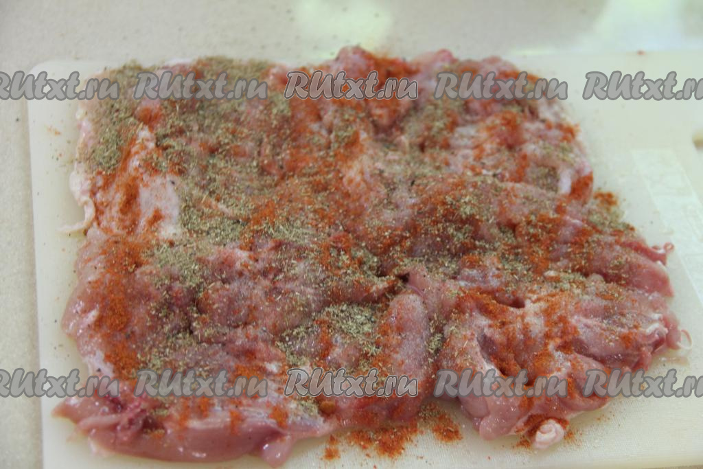 4 филе кожей вниз выложить на плоскую поверхность. Мясо нужно выкладывать немного внахлёст, при этом должен образоваться прямоугольник. Посолить мясо по вкусу, посыпать любимыми специями для мяса (у меня - паприка, карри и молотый чёрный перец) Оставить куриное мясо в таком виде на время, пока будем заниматься приготовлением омлета.