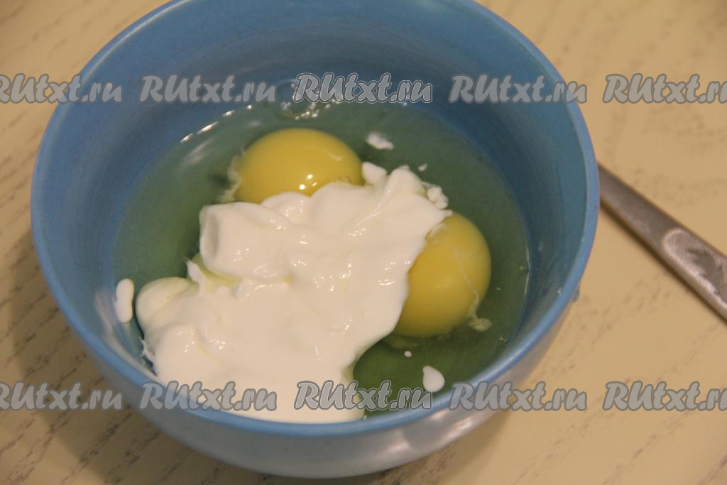 Для приготовления омлета в небольшую ёмкость разбить яйца, добавить сметану, посолить по вкусу.