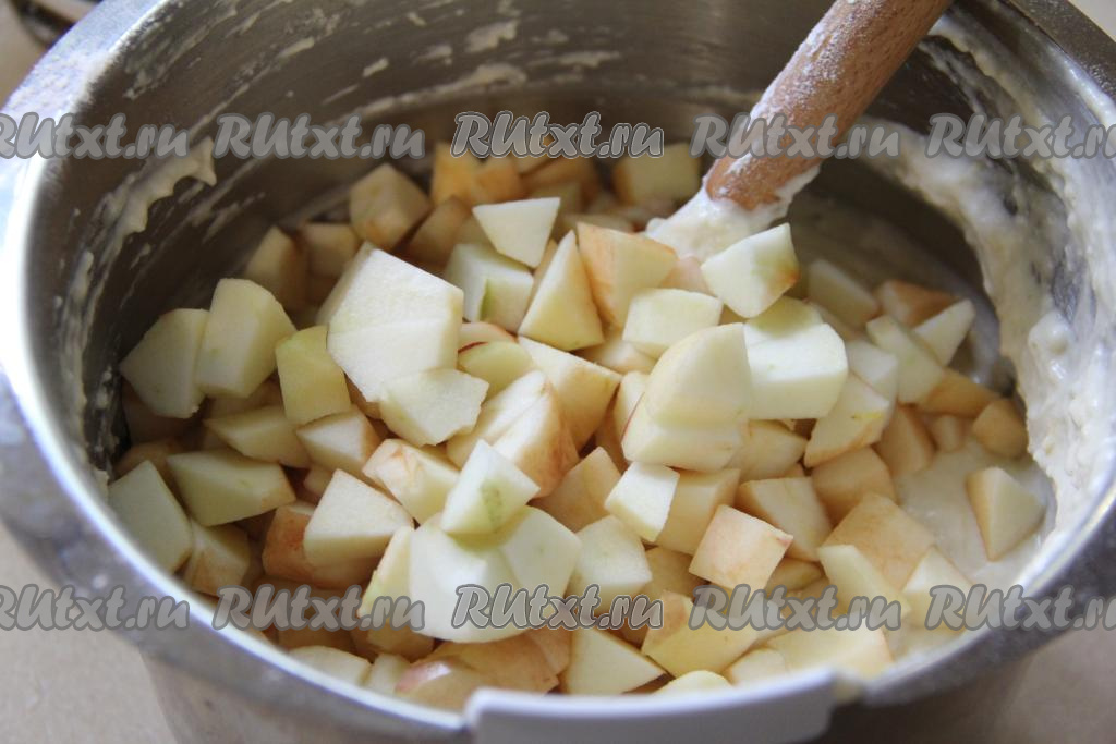 Яблоки помыть, по желанию, очистить от кожуры, нарезать на квадратики размером 1 сантиметр на 1 сантиметр, удаляя семенную коробку с семечками. Добавить яблоки в тесто и аккуратно перемешать лопаткой, равномерно распределяя кусочки яблок по всему тесту.