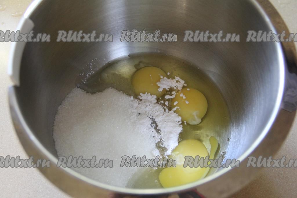 В чаше миксера соединить яйца, сахар и ванильный сахар.