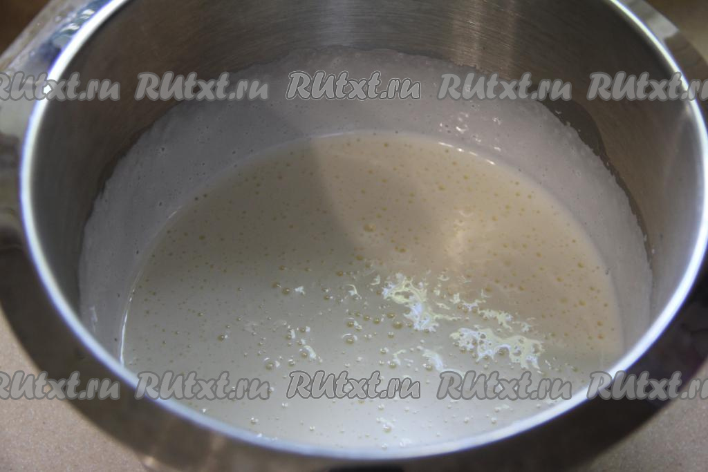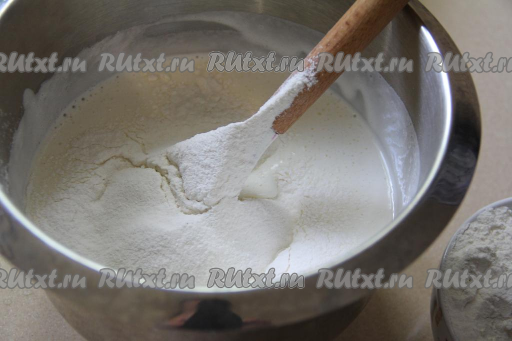 Всыпать разрыхлитель, добавить соду, погашенную лимонным соком (или столовым 9% уксусом), перемешать. Затем частями начать всыпать муку в тесто, каждый раз хорошо вмешивая её. Итоговое тесто для пирога должно напоминать сметану средней густоты, оно будет медленно стекать с лопатки.