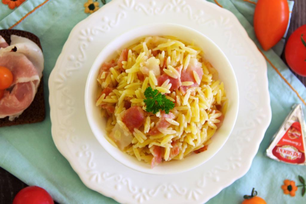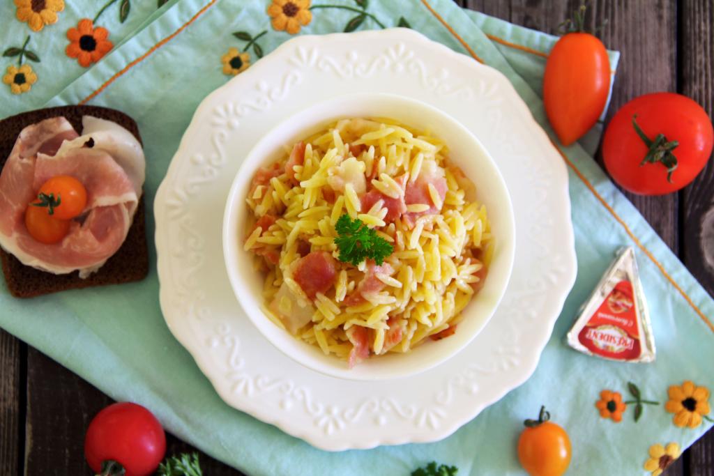 Паста "Орзо" - это разновидность макаронных изделий, внешне похожая на рис. Мои дети очень любят такую пасту, поэтому подаю её с добавлением различных ингредиентов. В этот раз предлагаю приготовить "Орзо" с беконом. Для того чтобы блюдо стало более насыщенным, я ещё добавила немного плавленного сыра, но, конечно, можно обойтись и без него. Паста "Орзо", приготовленная с беконом, получается очень нежной и ароматной, сытной и вкусной. Нам очень нравится это простое блюдо, советую попробовать и вам!