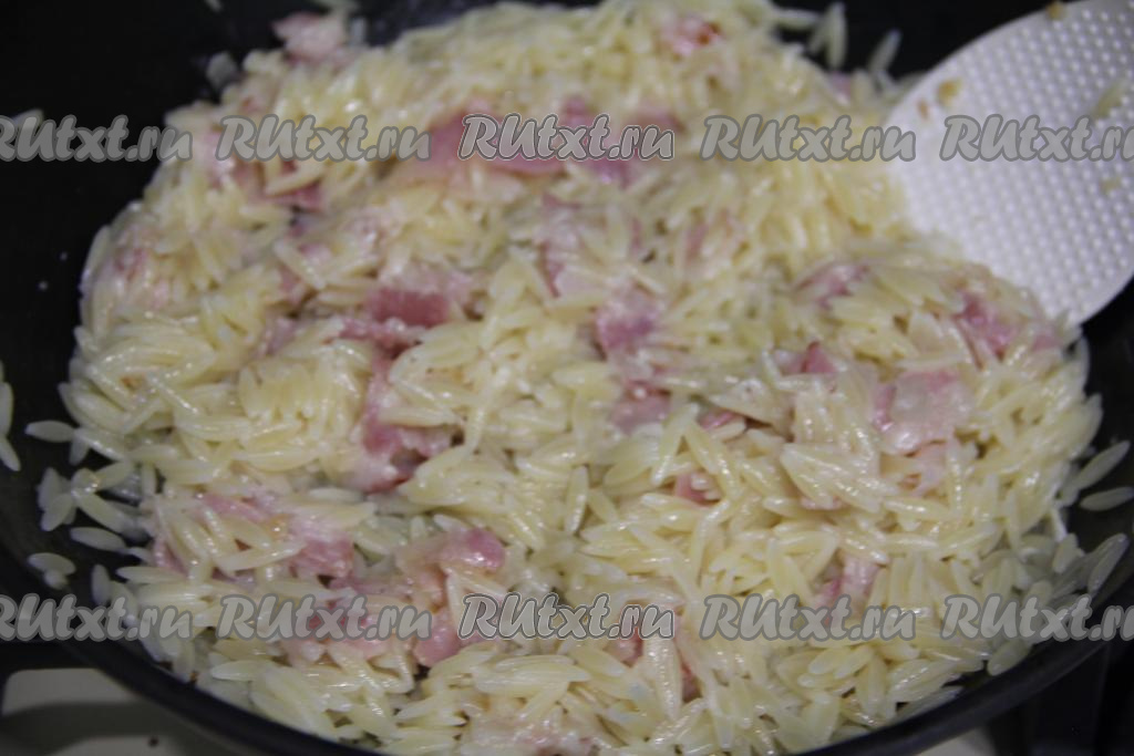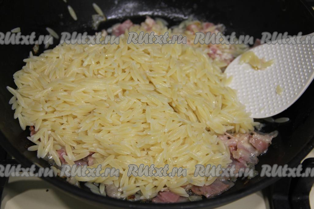 Выложить орзо в сковороду с беконом.