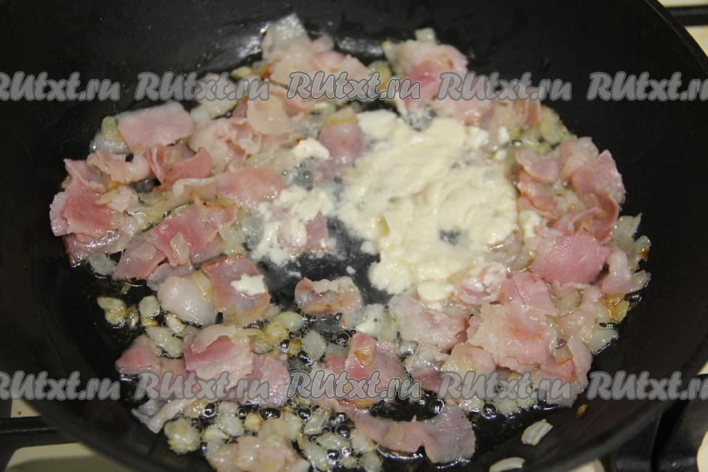 Затем выложить плавленный сыр, нарезанный на небольшие кусочки. Для того чтобы сыр лучше расплавился, его можно залить несколькими столовыми ложками горячей воды, перемешать. Прогреть сыр с беконом, помешивая, на небольшом огне до получения однородной массы.