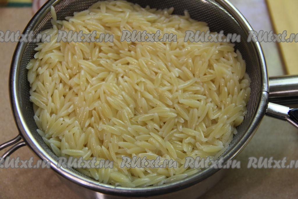 Пасту "Орзо", отваренную до готовности, откинуть на сито.