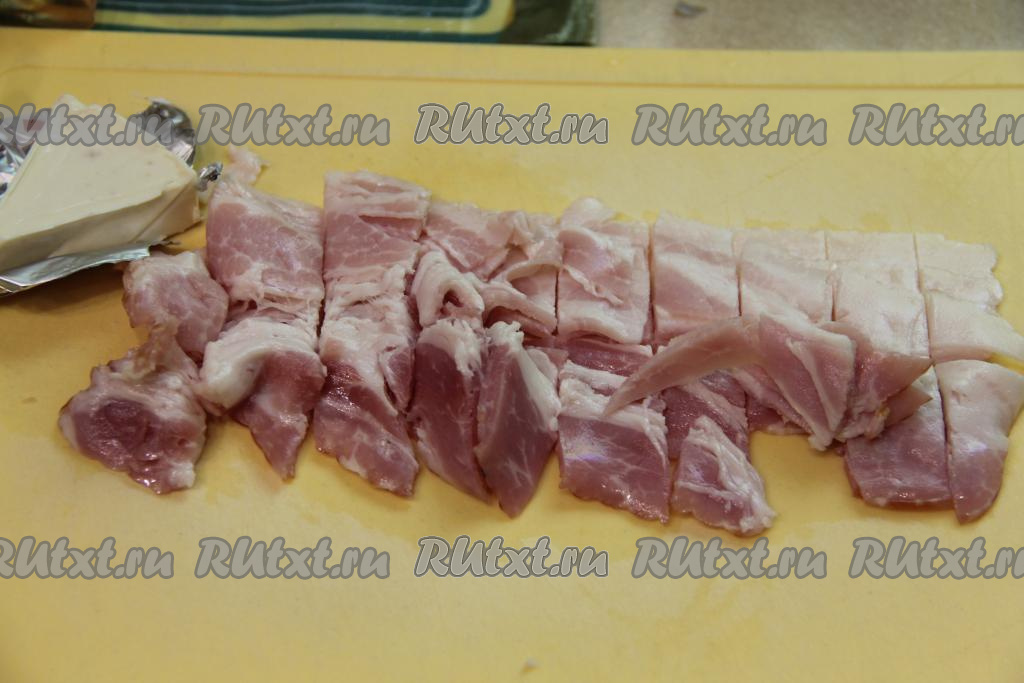 Бекон нарезать на кусочки.Шаг 3 из 8: