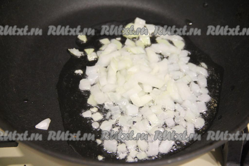 Пока варится паста, займёмся обжариванием. Для этого в сковороде нужно прогреть растительное масло, затем выложить мелко нарезанные лук и чеснок, перемешать и обжаривать на среднем огне 3-4 минуты, иногда помешивая.