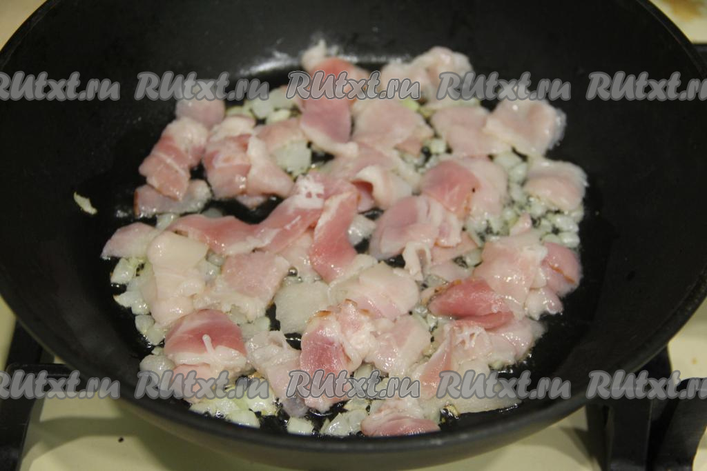 К луку, обжаренному с чесноком, выложить нарезанный бекон, перемешать и обжаривать 3-4 минуты, время от времени перемешивая.
