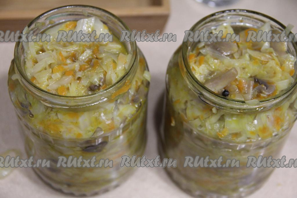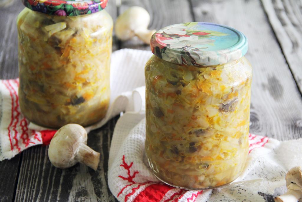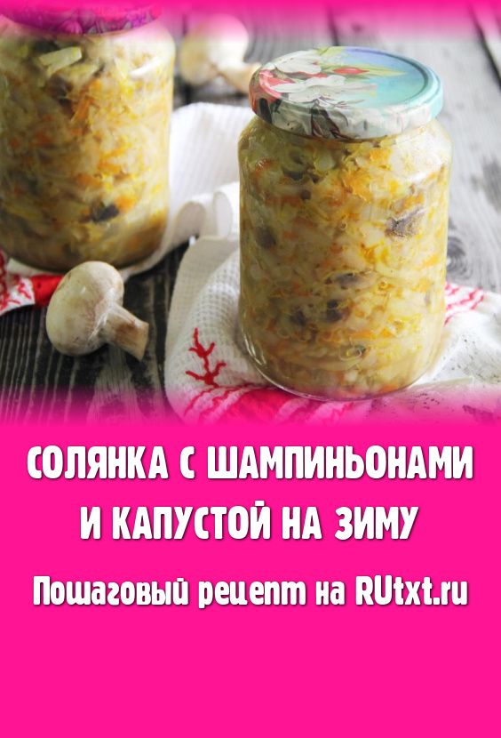 Осенью можно сделать немало отличных заготовок из капусты. В этот раз предлагаю приготовить на зиму солянку с шампиньонами и капустой. Рецепт несложный. Солянка получается очень вкусной, аппетитной, пикантной. Зимой её можно подать в качестве дополнения к гарнирам (например, к картошке или рису), мясу, птице. Из указанного количества ингредиентов выходит 1 литр 600 миллилитров солянки.
