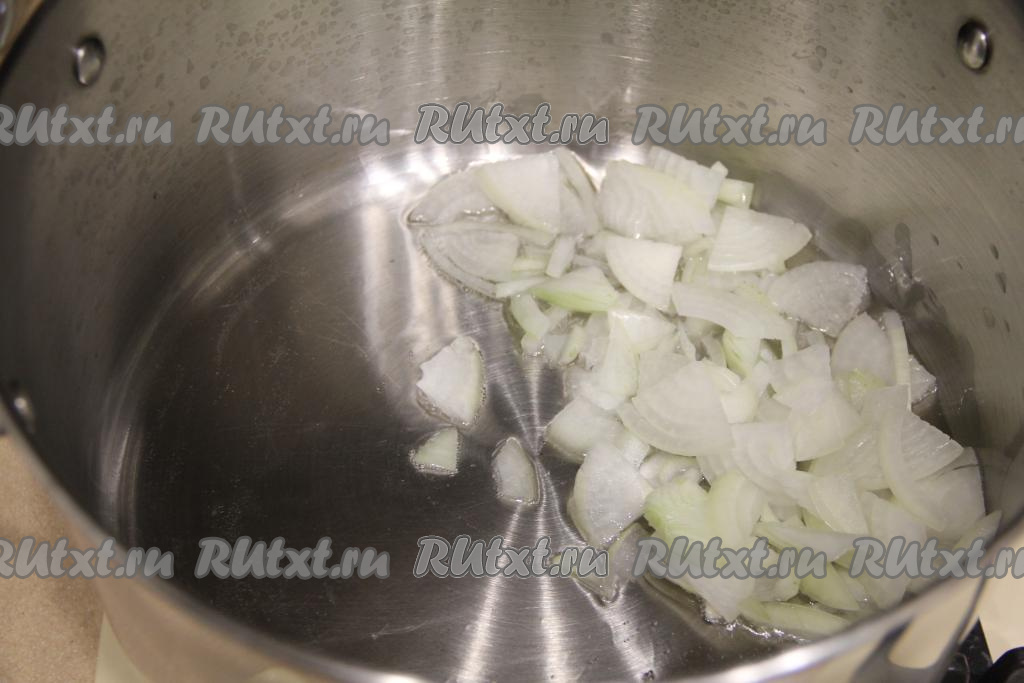 Лук мелко нарезать. В глубокую кастрюлю с толстым дном влить растительное масло, поставить на огонь, разогреть, выложить мелко нарезанный лук и уменьшить огонь до среднего. Обжарить лук, периодически перемешивая, в течение 3-4 минут (до прозрачности лука).