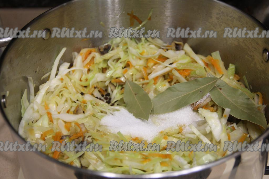 Затем всыпать соль, сахар, добавить лавровые листья и горошины перца, перемешать и тушить на медленном огне 25-35 минут (до мягкости капусты, продолжительность тушения во многом зависит от сорта капусты), периодически перемешивая.