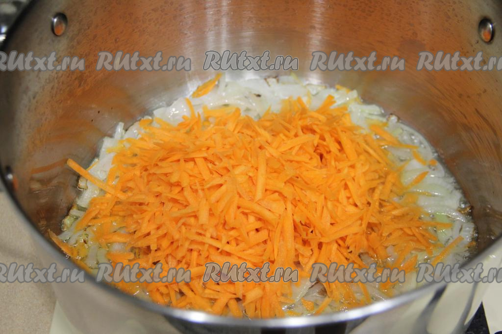 После этого добавить в кастрюлю морковку, натёртую на крупной тёрке, перемешать овощи и обжаривать их минут 5-6 (морковь должна стать мягкой), иногда помешивая.