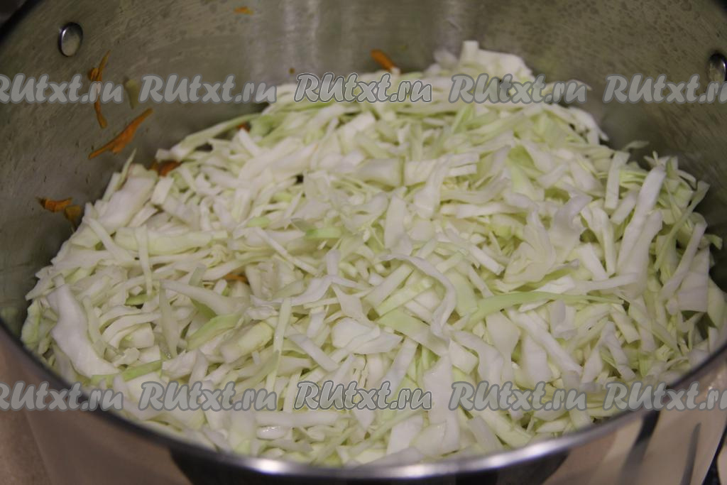 Далее выложить в кастрюлю тонко нарезанную капусту, перемешать и обжаривать минут 7-10 (капуста должна обмякнуть), периодически перемешивая.