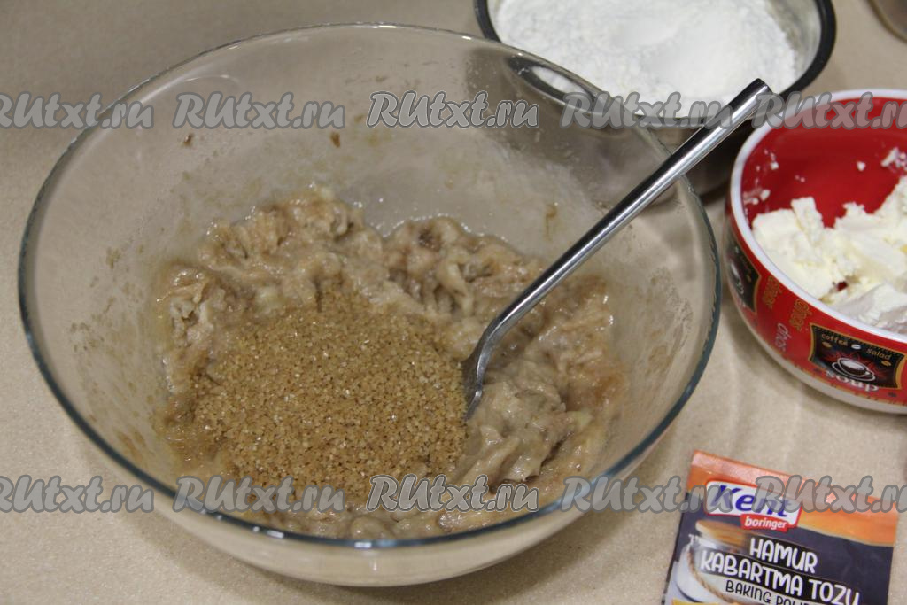 Бананы очистить, поломать на кусочки, выложить в объёмную миску, добавить сахар. У меня сахар тростниковый, можно использовать обычный сахар. Размять бананы с сахаром с помощью вилки до получения однородной массы.