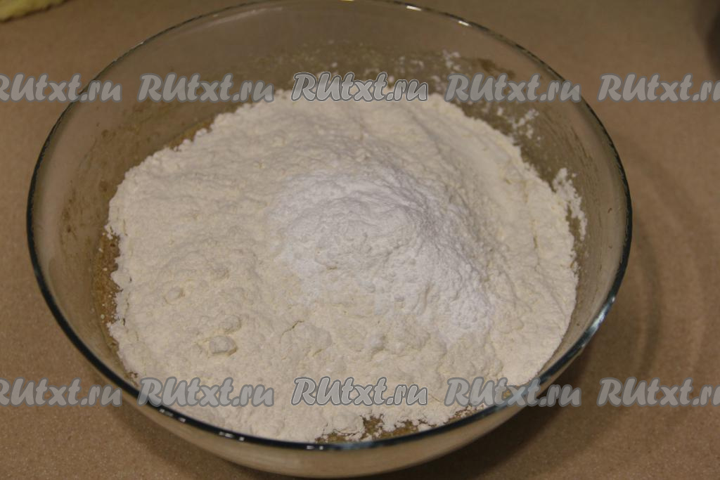 Всыпать разрыхлитель и соль. Затем частями добавлять просеянную муку, каждый раз перемешивая тесто до однородности.