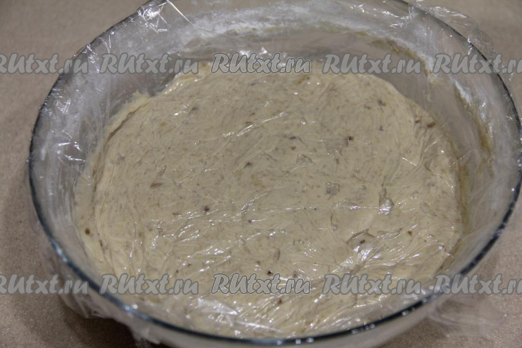 Добавляя муку, учитывайте, что банановое тесто должно получиться вязким и тягучим. Накрыть тесто пищевой плёнкой и убрать в холодильник на 1 час.