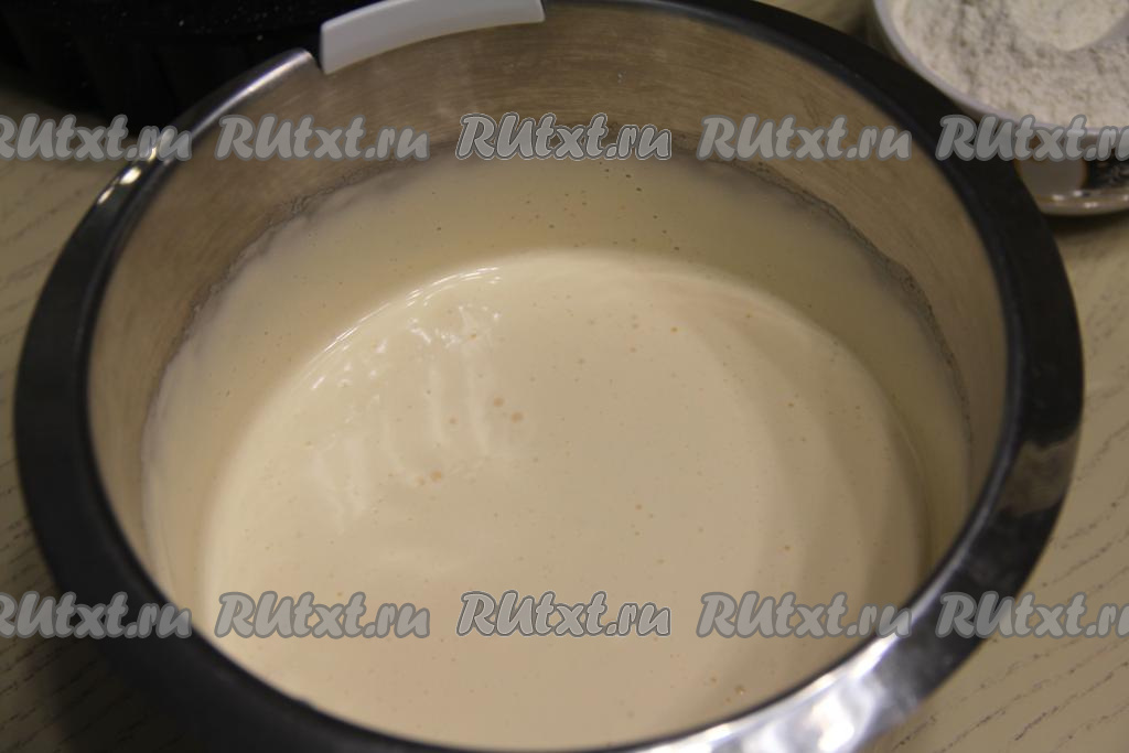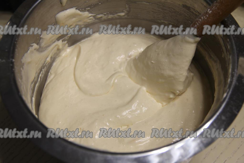 Всыпая понемногу муку, ориентируйтесь на густоту замешиваемого теста, а не на указанное количество муки. Муки может потребоваться как больше, так и меньше, главное, чтобы тесто получилось однородным, воздушным, как на фото, напоминающим сметану средней жирности.