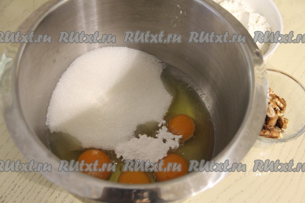 В чаше миксера соединить сахар, яйца и ванильный сахар.