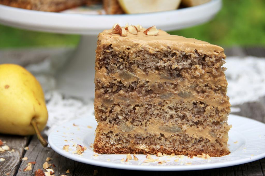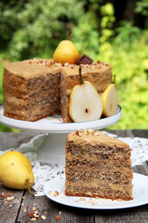 Нежный, вкусный, в меру сладкий торт, приготовленный с грецкими орехами и карамелизированными грушами, нарезать на части и подать к столу. Посмотрите, как восхитителен этот торт в разрезе!