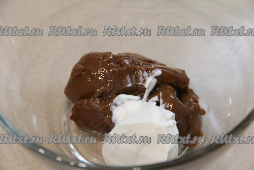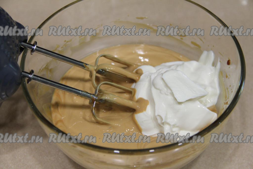 Для приготовления крема в объёмной миске соединить варёную сгущёнку и 2-3 столовых ложки сметаны, взбить миксером до полной однородности (растворения сгущёнки).