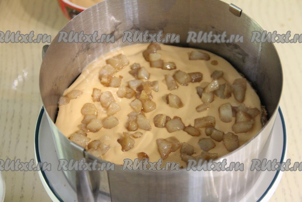 Затем выложить в кольцо следующий корж, смазать его одной частью крема, разложить часть грушевой начинки. Таким образом, чередуя коржи, крем и начинку, собрать весь торт. Верхний корж торта просто покрыть кремом без груш. Поставить торт в холодильник на ночь. Затем снять кольцо. Вот такой орехово-грушевый тортик получился.
