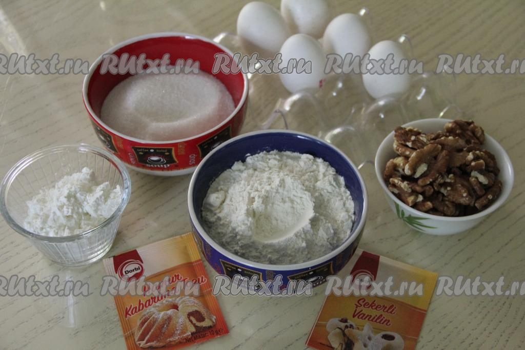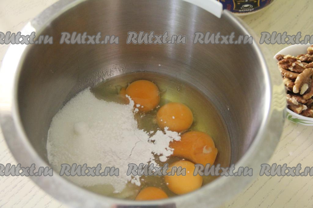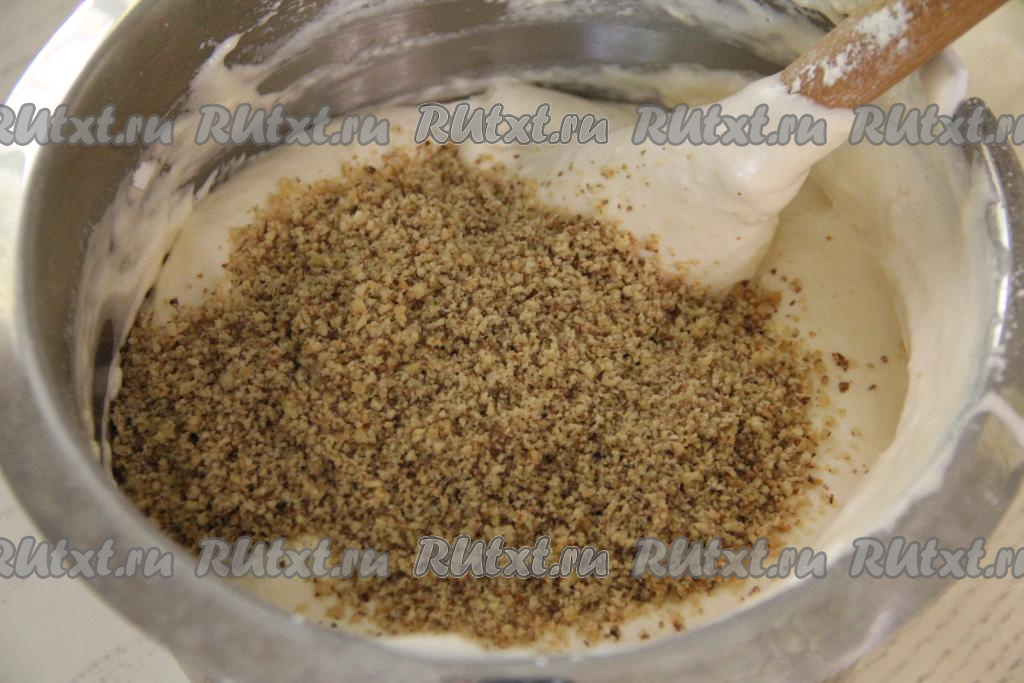 Добавляя муку, учитывайте, что бисквитное тесто должно получиться очень воздушным, в меру густым. Грецкие орехи измельчить в крошку и добавить в тесто, перемешать лопаткой до однородности.
