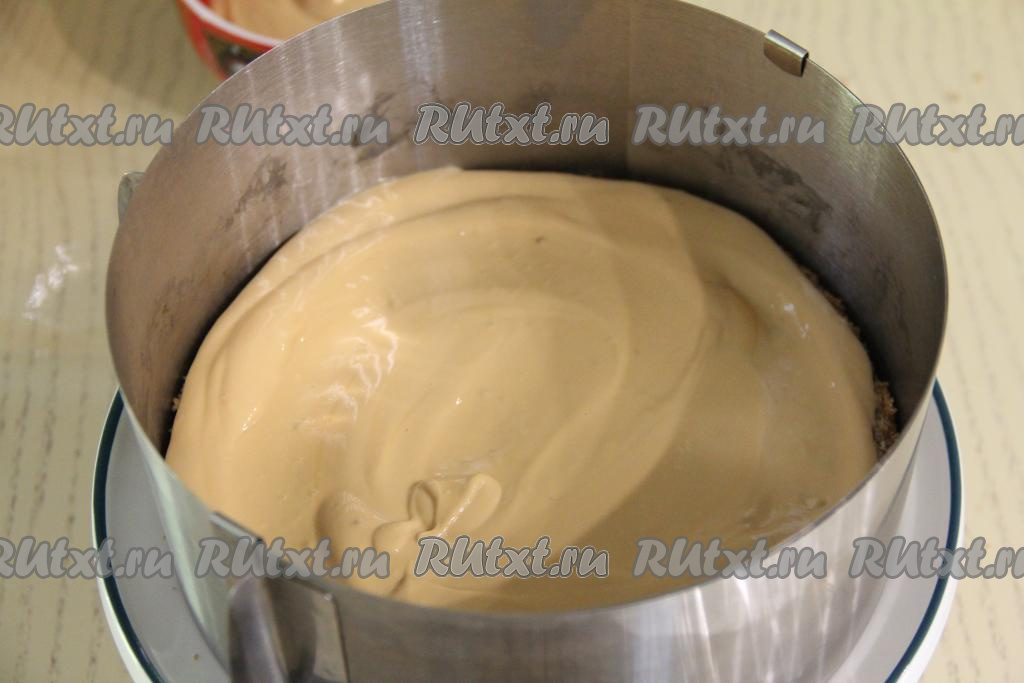 Остывший ореховый бисквит разрезать на 4 коржа. Кулинарное кольцо поставить на достаточно плоскую тарелку. В кольцо выложить первый корж.
