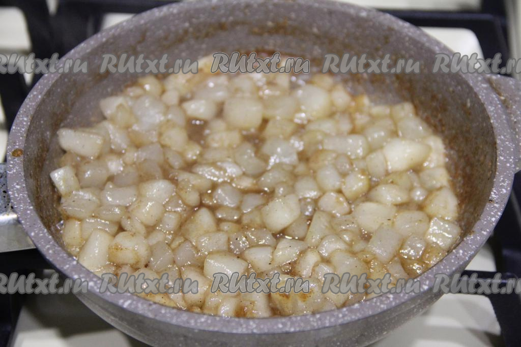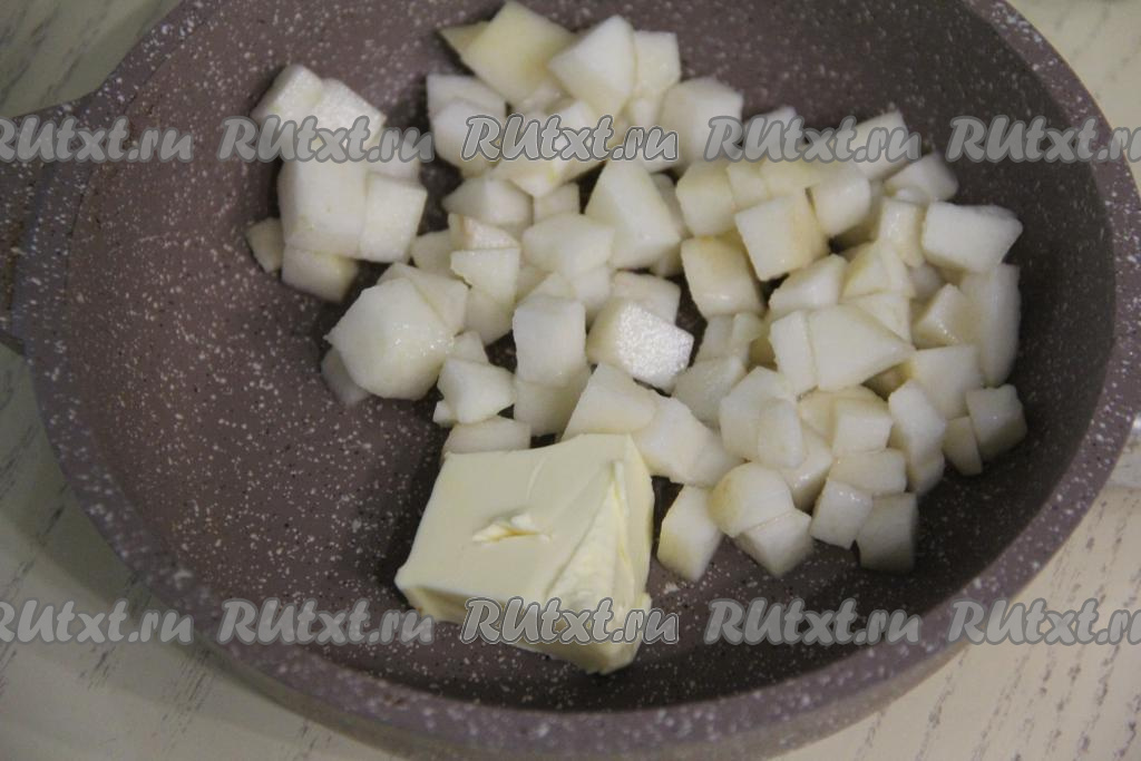 Груши вымыть, очистить от кожуры, нарезать на кубики со стороной размером 1 сантиметр, удаляя семенную коробку и семечки. В сковороду выложить сливочное масло и нарезанные груши, поставить на огонь чуть ниже среднего.