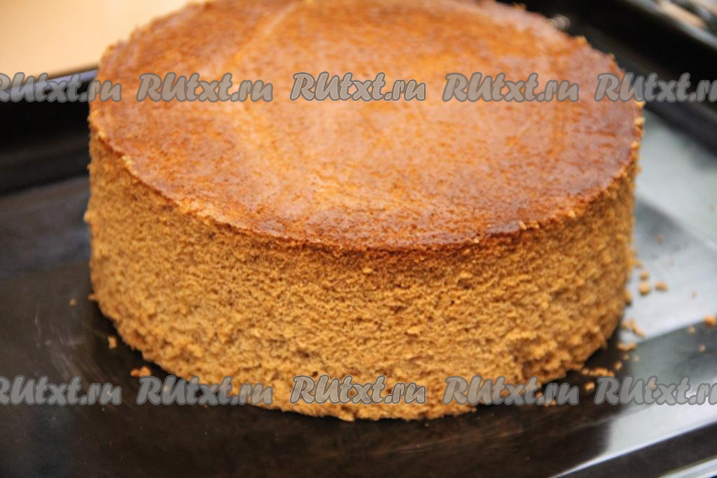 Крем из сметаны и варёной сгущёнки зрительно разделить на 5 частей. Корж, выложенный в кольцо, смазать частью крема.