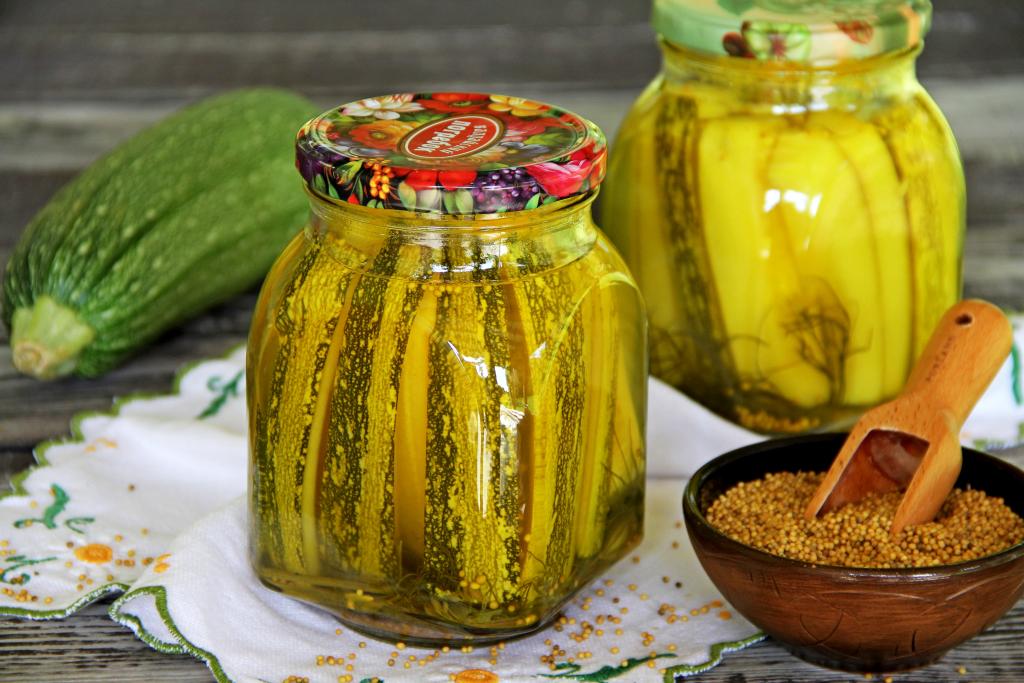 Зимой консервированные овощи вносят приятное разнообразие в меню. Поэтому предлагаю приготовить на зиму кабачки, маринованные с горчицей и куркумой. Кабачки получаются очень яркими, пикантными, хрустящими. Они станут отличным дополнением к различным гарнирам (например, к картошке, рису) или к мясу, птице. Из указанного количества ингредиентов получается 5 банок объёмом по 500 миллилитров наивкуснейших маринованных кабачков.