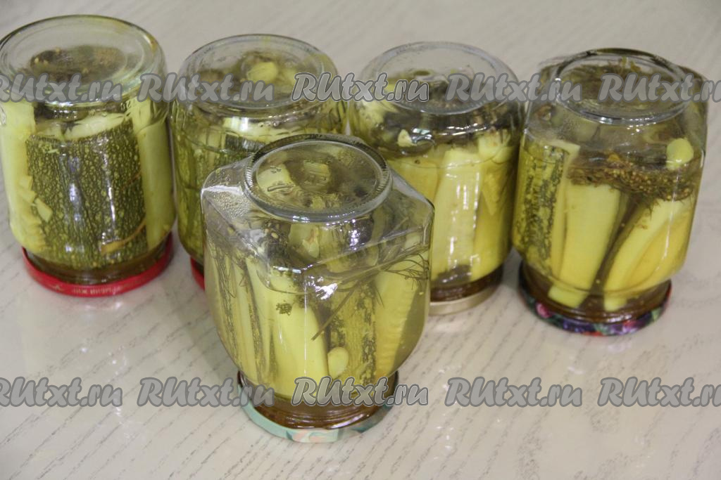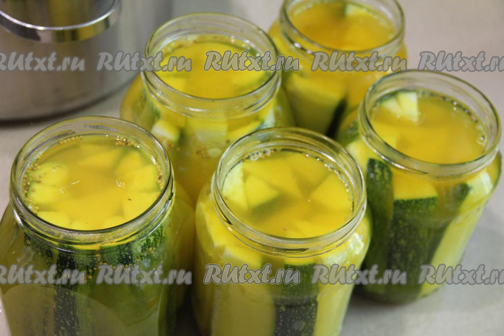Залить кабачки в банках горячим маринадом.