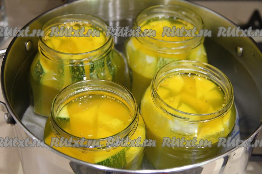 На дно объёмной кастрюли выложить полотенце (или тряпочку, сложенную в 2-3 раза), на него поставить банки с кабачками. Накрыть банки предварительно прокипячёнными крышками. В кастрюлю с банками с кабачками влить тёплую воду, она должна доходить до плечиков банок. Поставить эту кастрюлю на средний огонь. После закипания воды в кастрюле уменьшить огонь и стерилизовать банки с заготовкой 15 минут.