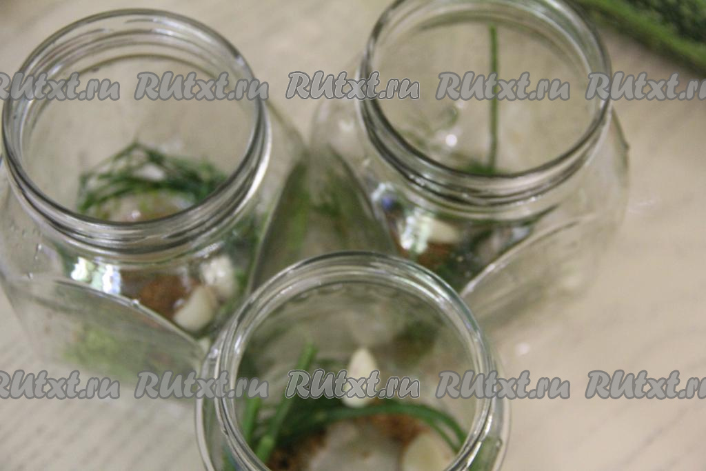 Чеснок почистить. Кабачки и зонтики укропа вымыть. Для этой консервации нужно брать молодые кабачки с мелкими семечками. Если кожура у кабачков тонкая, её можно не срезать. У меня общий вес подготовленных кабачков был около 2,3 килограммов. Банки (я взяла 5 банок объёмом по 500 миллилитров) простерилизовать любым удобным способом. Крышки прокипятить с момента закипания воды в течение 3 минут. В каждую подготовленную банку выложить зонтик укропа, 3 зубчика чеснока.