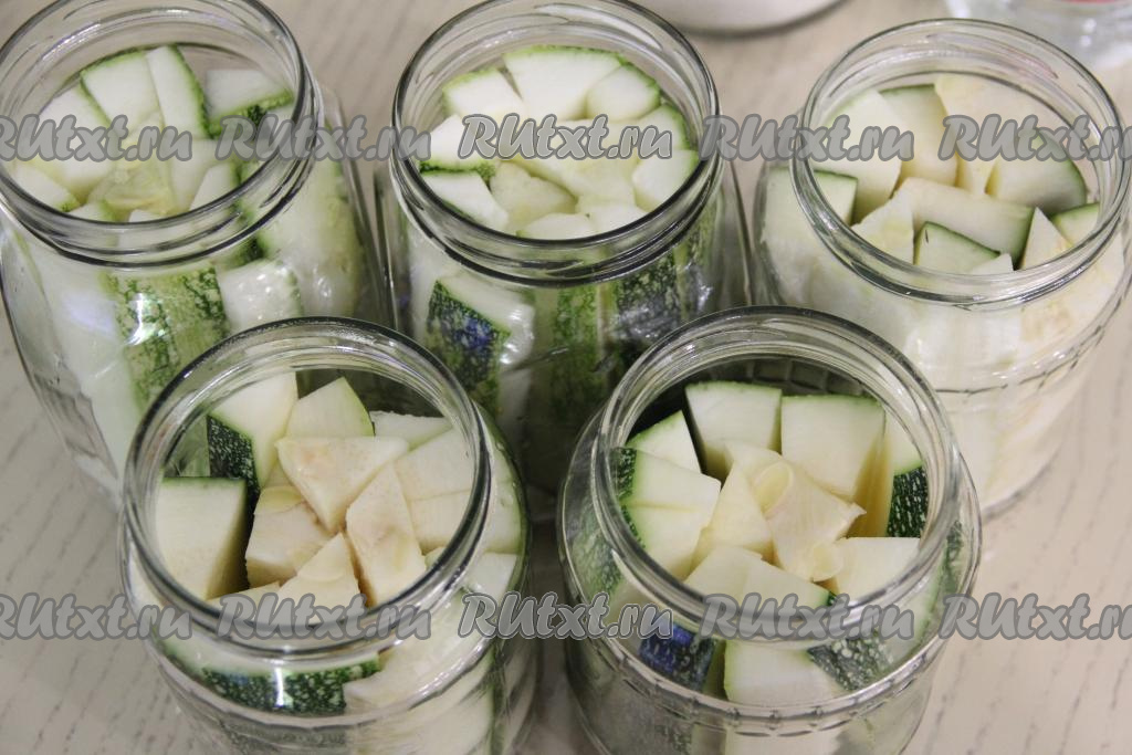 Кабачки нарезать на брусочки и выложить плотно в банку, как на фото.