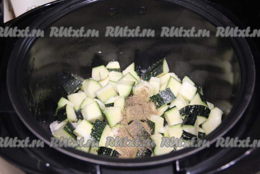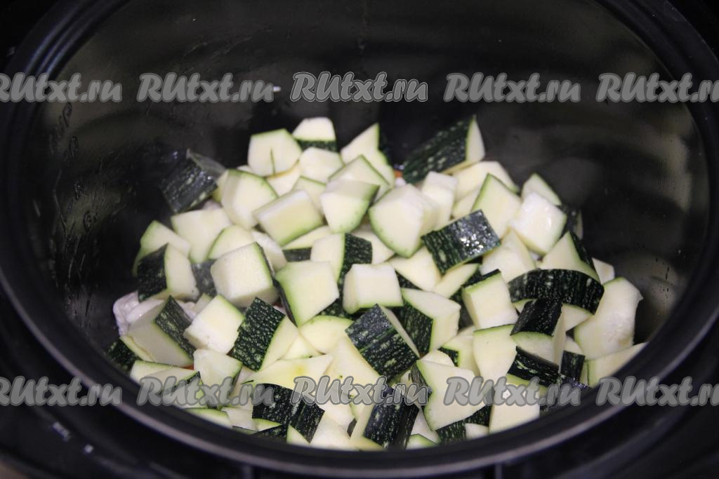 Далее добавить кабачок, нарезанный на кубики со стороной 1,5 сантиметра.