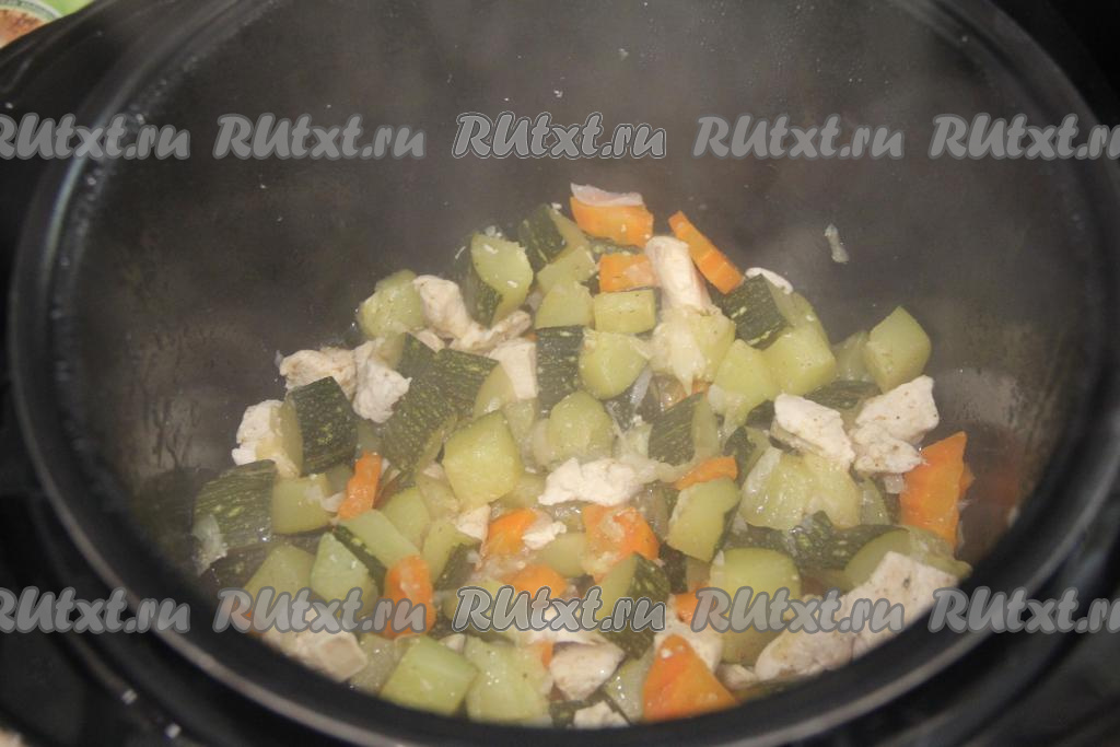 К овощам и куриному мясу добавить соль и специи по вкусу, перемешать, закрыть крышку мультиварки. Выставить режим "Тушение" и готовить филе куриной грудки с кабачками 30 минут.