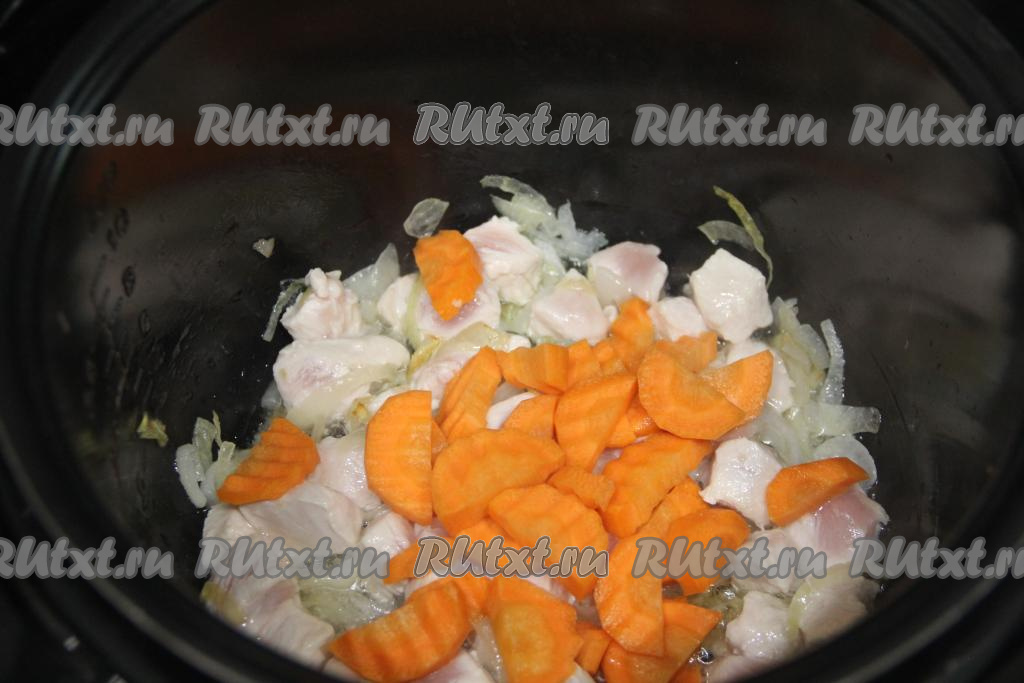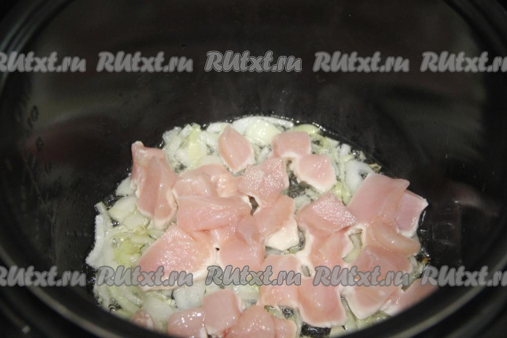 Куриное филе вымыть, обсушить, нарезать на средние кусочки, выложить к обжаренному луку. Готовить на режиме "Жарка" минуты 3-4 (до побеления мяса со всех сторон), периодически перемешивая. Крышку мультиварки на режиме "Жарка" закрывать не нужно.