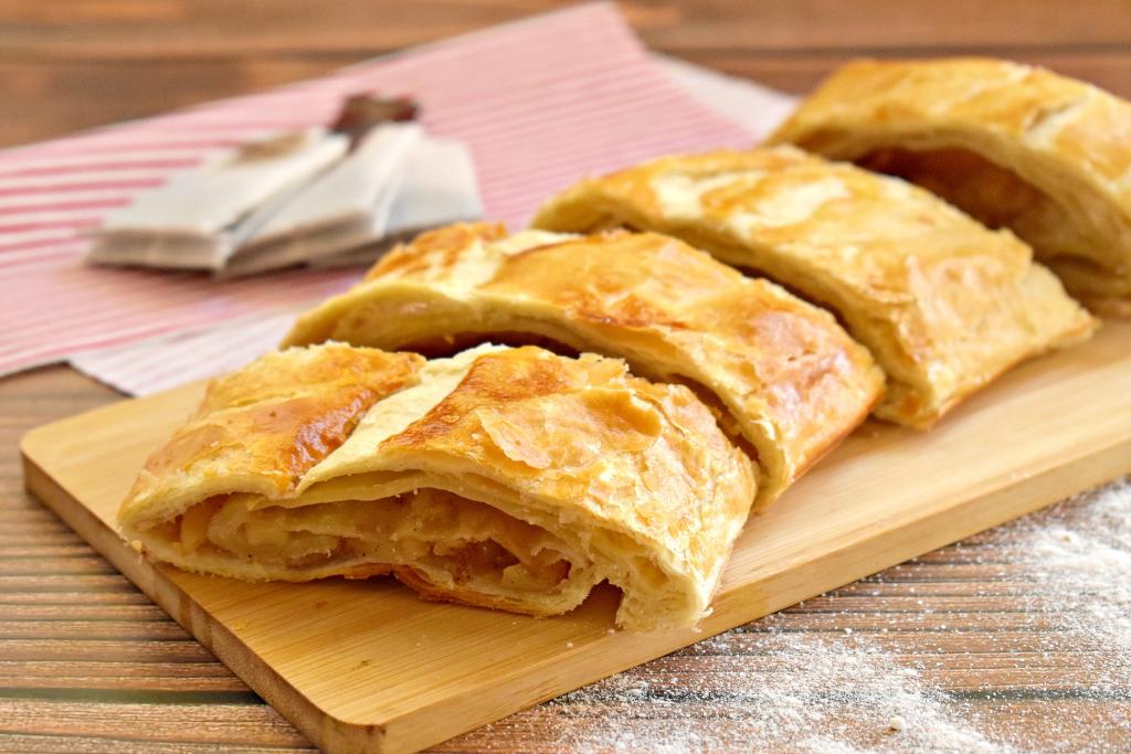 Для приготовления этого штруделя можно взять как дрожжевое, так и бездрожжевое слоёное тесто.