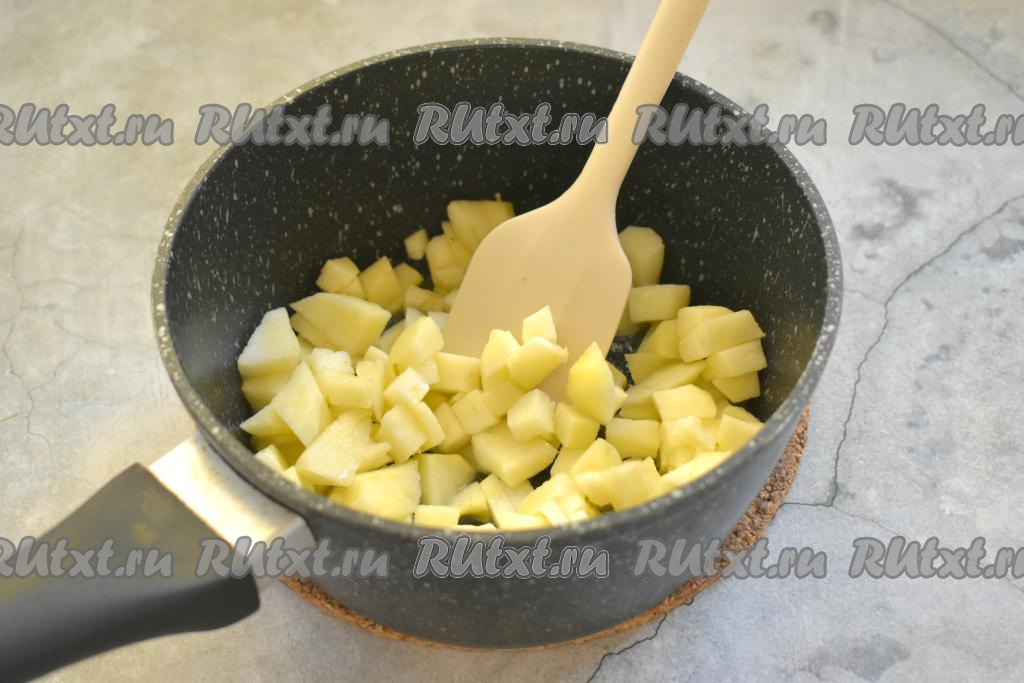 Заранее достаём из морозилки слоёное тесто и оставляем оттаивать при комнатной температуре. Тесто должно стать мягким. Яблоки очищаем от кожуры и семечек, нарезаем на маленькие кубики. В сотейник (или в сковороду) кладём кусочек сливочного масла, ставим на средний огонь. Растапливаем масло.
