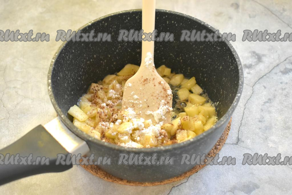 На умеренном огне тушим яблоки до мягкости (ориентировочно минут 10), периодически перемешивая. Затем к яблокам всыпаем крахмал и корицу, перемешиваем карамелизированные яблоки и снимаем с огня. Даём остыть и начинка для штруделя из слоёного теста готова.